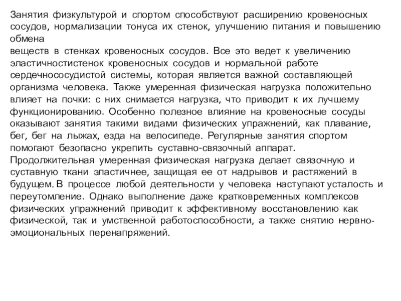 веществ в стенках кровеносных сосудов. Все это ведет к увеличению эластичностистенок кровеносных сосудов и нормальной работе сердечнососудистой системы, которая является важной составляющей организма человека. Также умеренная физическая нагрузка положительно влияет на почки: с них снимается нагрузка, что приводит к их лучшему функционированию. Особенно полезное влияние на кровеносные сосуды оказывают занятия такими видами физических упражнений, как плавание, бег, бег на лыжах, езда на велосипеде. Регулярные занятия спортом помогают безопасно укрепить суставно-связочный аппарат.
