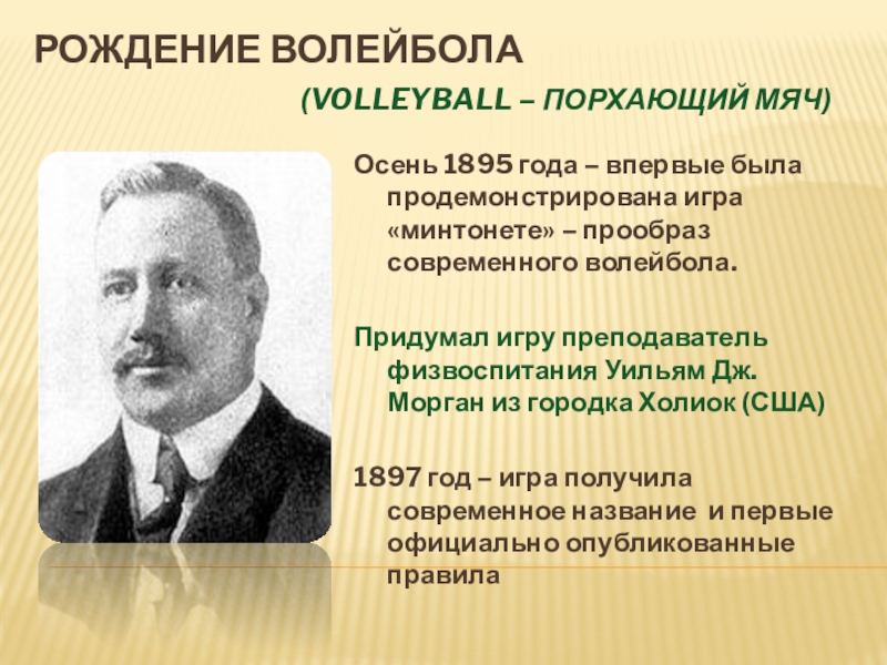 Придумал игру преподаватель физвоспитания Уильям Дж. Морган из городка Холиок (США)