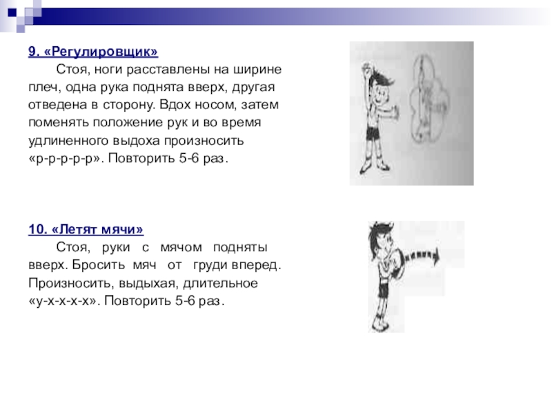 9. «Регулировщик»	Стоя, ноги расставлены на ширинеплеч, одна рука поднята вверх, другаяотведена в сторону. Вдох носом, затемпоменять положение