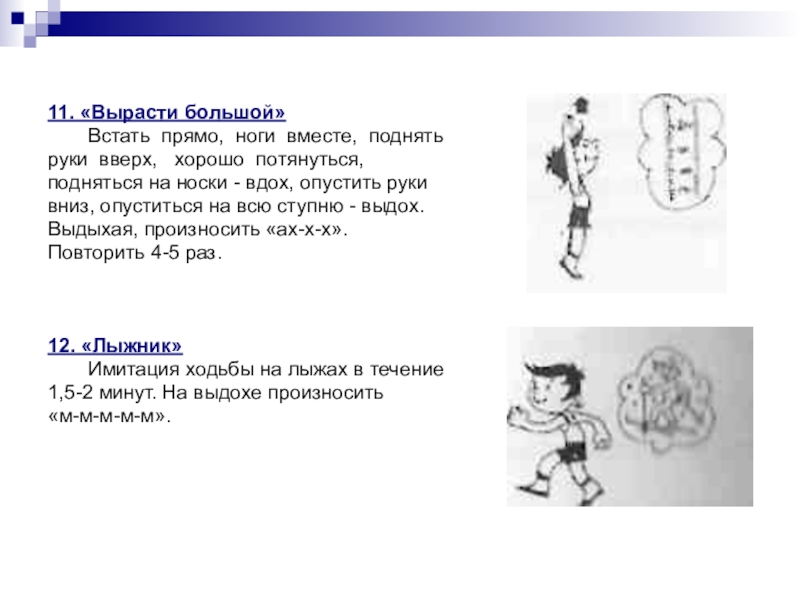 11. «Вырасти большой»	Встать прямо, ноги вместе, поднятьруки вверх,  хорошо потянуться,подняться на носки - вдох, опустить рукивниз,