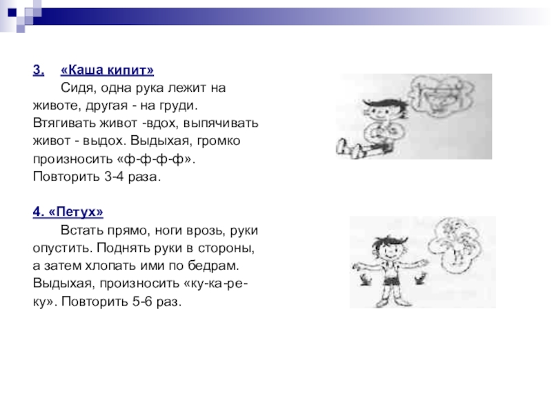 3.	«Каша кипит»	Сидя, одна рука лежит наживоте, другая - на груди.Втягивать живот -вдох, выпячиватьживот - выдох. Выдыхая, громкопроизносить