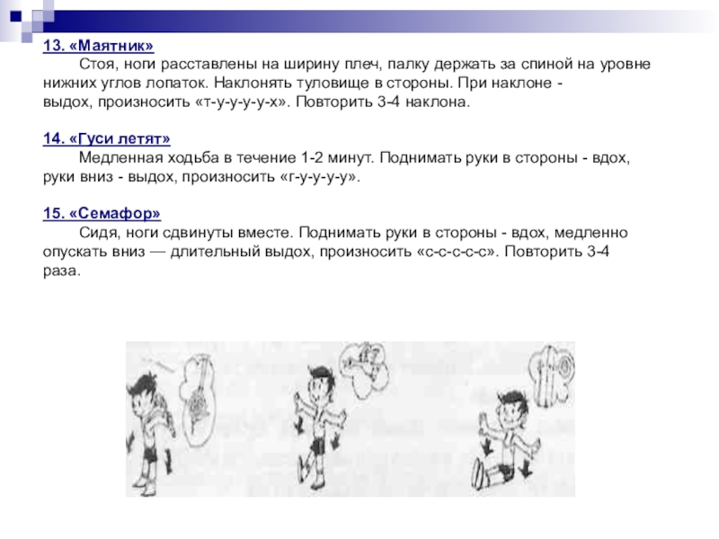 13. «Маятник»	Стоя, ноги расставлены на ширину плеч, палку держать за спиной на уровненижних углов лопаток. Наклонять туловище