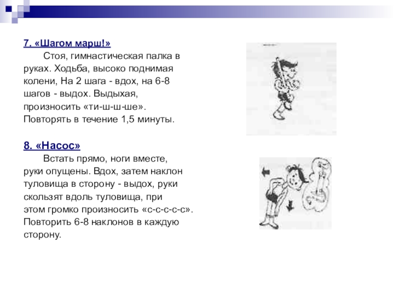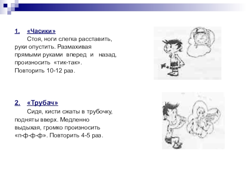 1. «Часики» Стоя, ноги слегка расставить,руки опустить. Размахиваяпрямыми руками вперед и назад,произносить «тик-так».Повторить 10-12 раз. 2. «Трубач» Сидя, кисти сжаты в трубочку,подняты вверх. Медленновыдыхая, громко произносить «п-ф-ф-ф». Повторить 4-5 раз.