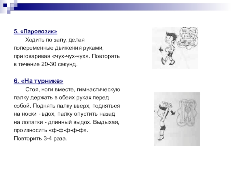 5. «Паровозик»	Ходить по залу, делаяпопеременные движения руками,приговаривая «чух-чух-чух». Повторятьв течение 20-30 секунд.6. «На турнике»	Стоя, ноги вместе, гимнастическуюпалку