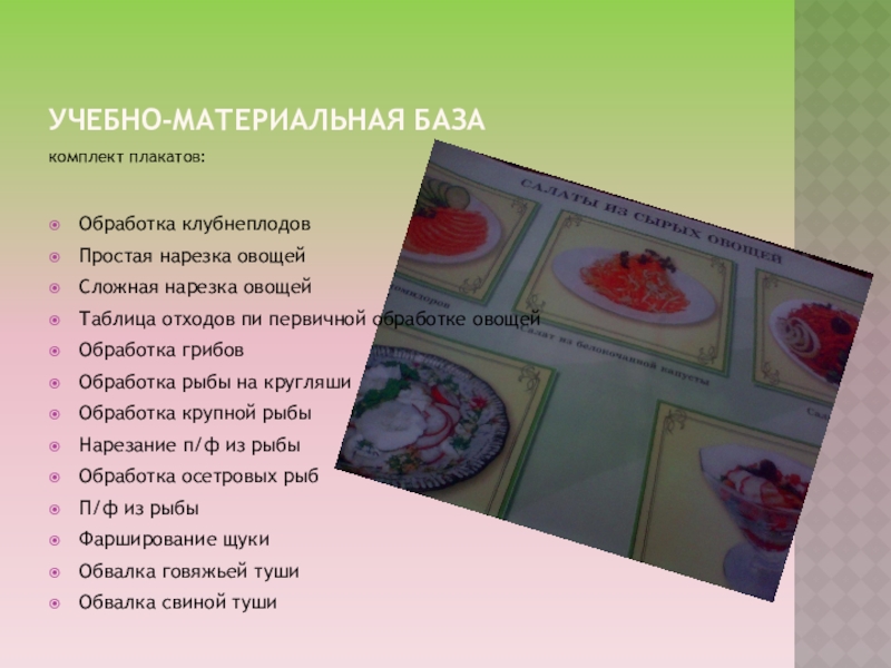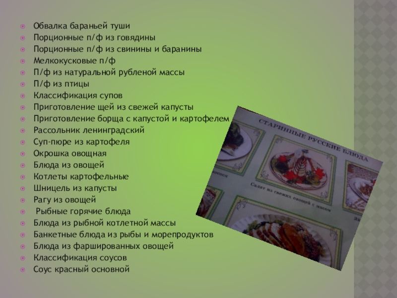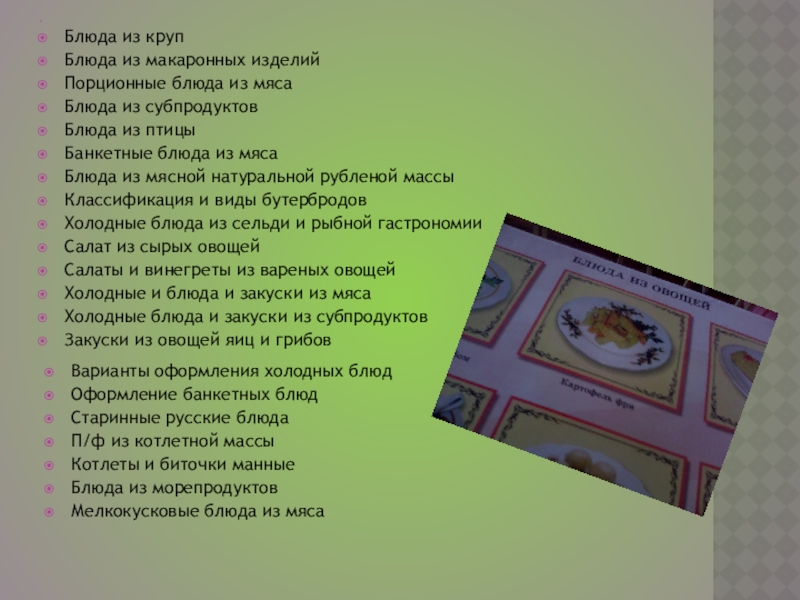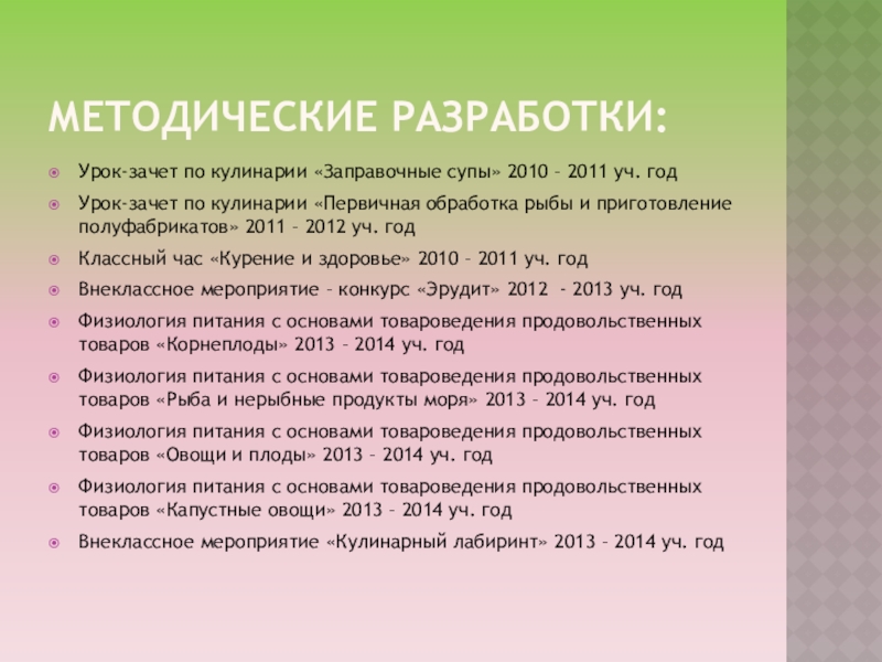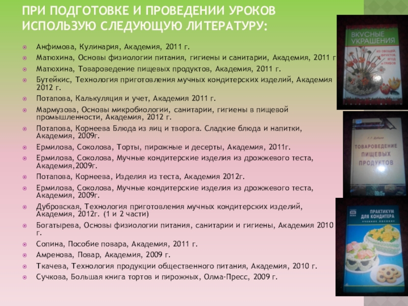 Конспекты по предметам: «Кулинария», «Основы санитарии, гигиены и физиологии питания», «Физиология питания с основами товароведения пищевых продуктов», «Основы микробиологии, санитарии и гигиены в пищевом производстве», «Санитария и гигиена», «МДК 01. 01 Технология обработки сырья и приготовление блюд из овощей и грибов», «МДК 02.01 Технология подготовки сырья и приготовление блюд и гарниров из круп, бобовых и макаронных изделий», МДК 05.01 Технология обработки сырья и приготовление блюд из мяса и домашней птицы», «МДК 07.01 Технология приготовления сладких блюд и напитков», «МДКА 08.01 Технология приготовления хлебобулочных, мучных и кондитерских изделий»