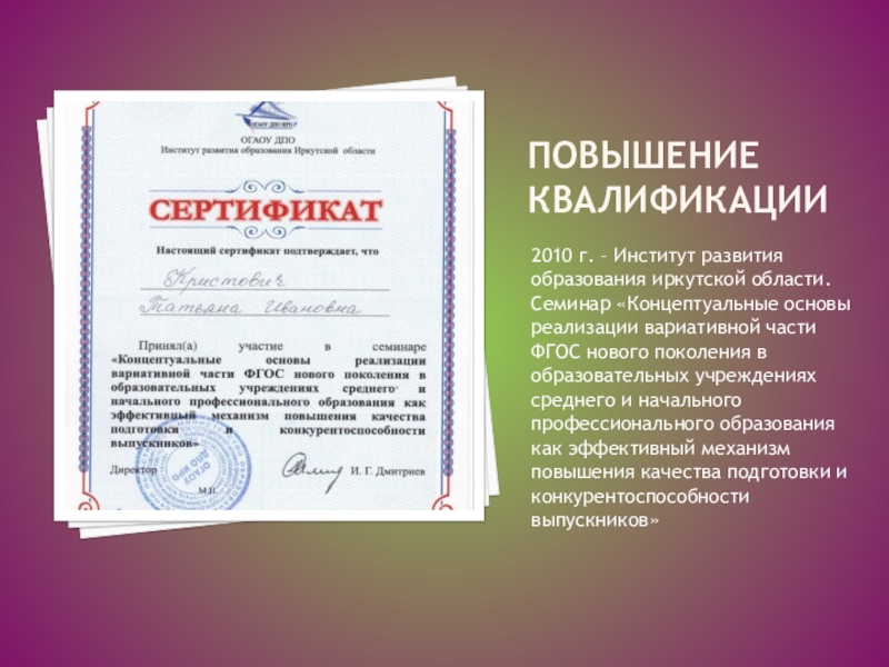 2010 г. – Институт развития образования иркутской области. Семинар «Концептуальные
