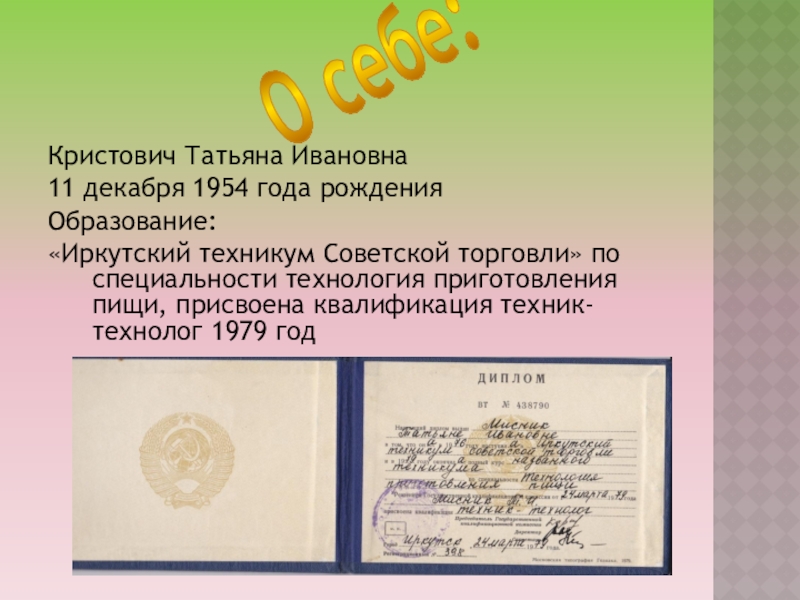 специальности технология приготовления пищи, присвоена квалификация техник-технолог 1979 год