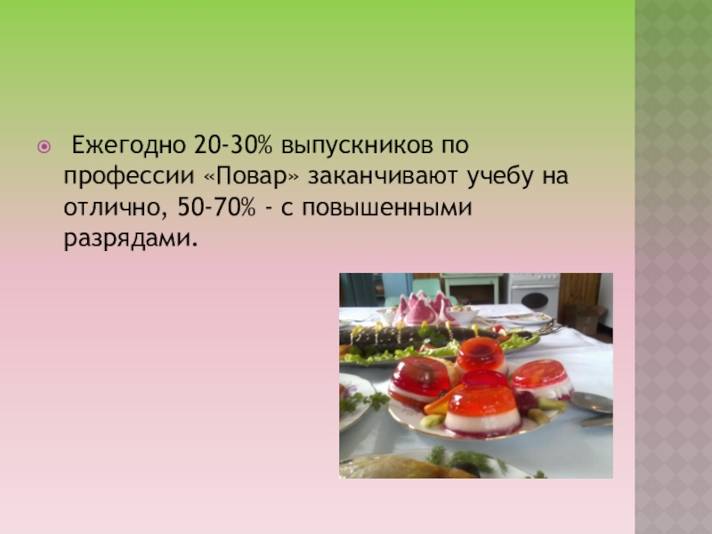 Слайд 39 Ежегодно 20-30% выпускников по профессии «Повар» заканчивают учебу на отлично,