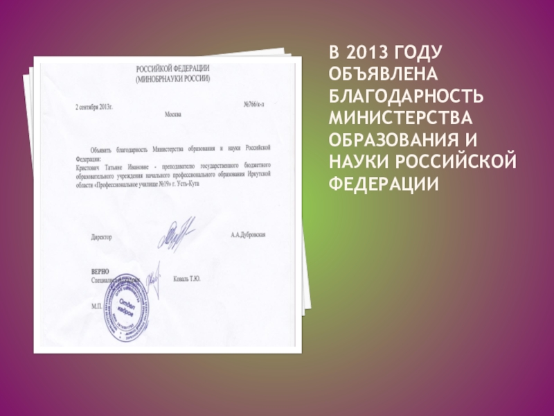 Слайд 15В 2013 году объявлена благодарность Министерства образования и науки Российской Федерации