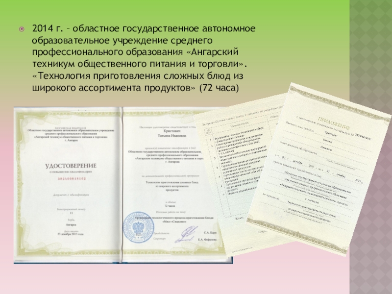 «Ангарский техникум общественного питания и торговли». «Технология приготовления сложных блюд из широкого ассортимента продуктов» (72 часа)