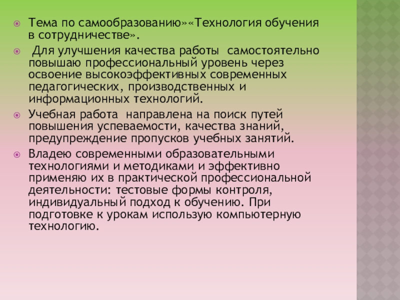 Слайд 21Тема по самообразованию»«Технология обучения в сотрудничестве».