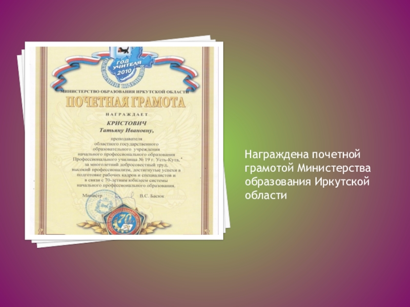 Слайд 14Награждена почетной грамотой Министерства образования Иркутской области
