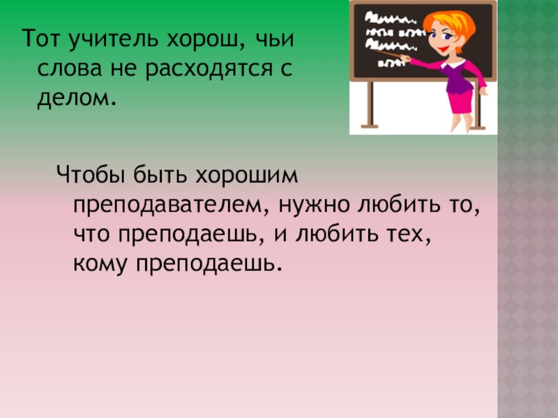 Слайд 48Тот учитель хорош, чьи слова не расходятся с делом.