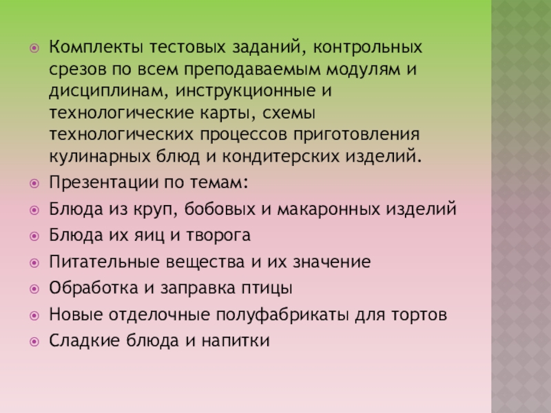 Слайд 46Комплекты тестовых заданий, контрольных срезов по всем преподаваемым модулям и дисциплинам,