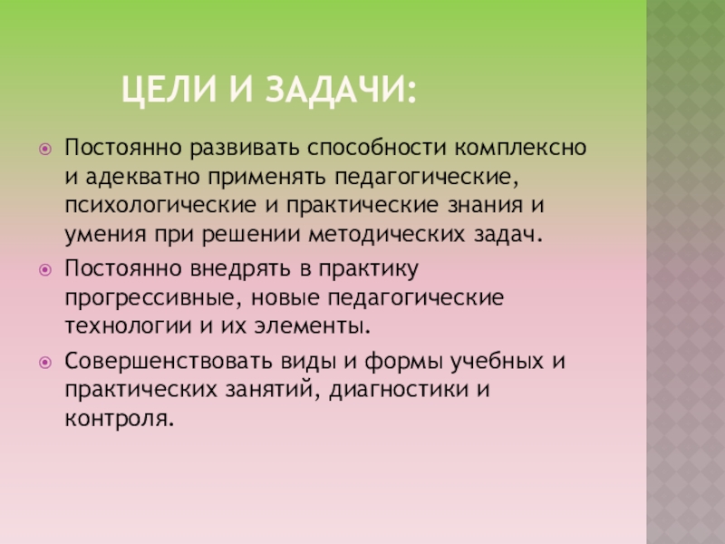 Постоянно внедрять в практику прогрессивные, новые педагогические технологии и их элементы.