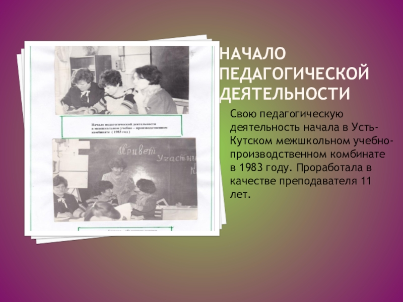 Свою педагогическую деятельность начала в Усть-Кутском межшкольном учебно-производственном комбинате