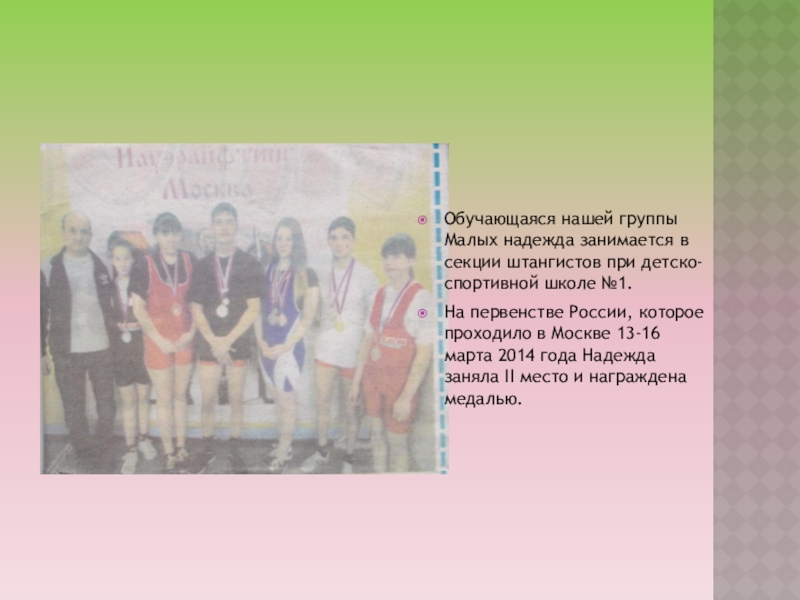 Слайд 37Обучающаяся нашей группы Малых надежда занимается в секции штангистов при детско-спортивной