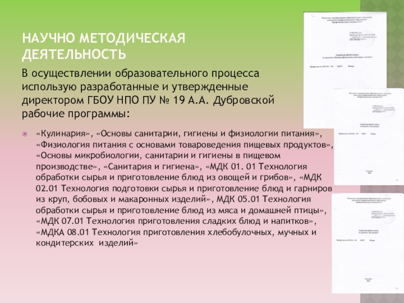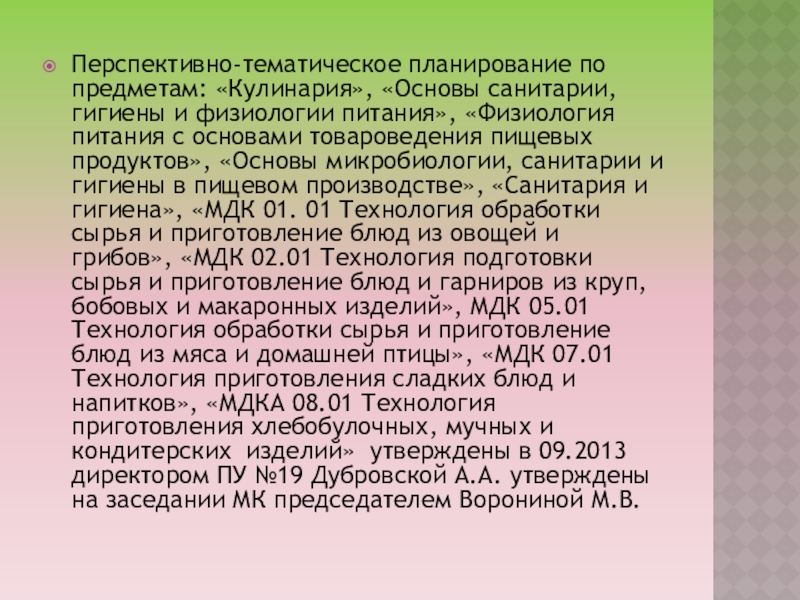 «Физиология питания с основами товароведения пищевых продуктов», «Основы микробиологии, санитарии и гигиены в пищевом производстве», «Санитария и гигиена», «МДК 01. 01 Технология обработки сырья и приготовление блюд из овощей и грибов», «МДК 02.01 Технология подготовки сырья и приготовление блюд и гарниров из круп, бобовых и макаронных изделий», МДК 05.01 Технология обработки сырья и приготовление блюд из мяса и домашней птицы», «МДК 07.01 Технология приготовления сладких блюд и напитков», «МДКА 08.01 Технология приготовления хлебобулочных, мучных и кондитерских изделий» утверждены в 09.2013 директором ПУ №19 Дубровской А.А. утверждены на заседании МК председателем Ворониной М.В.