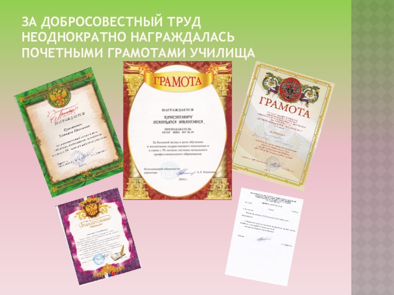 Слайд 13За добросовестный труд неоднократно награждалась почетными грамотами училища