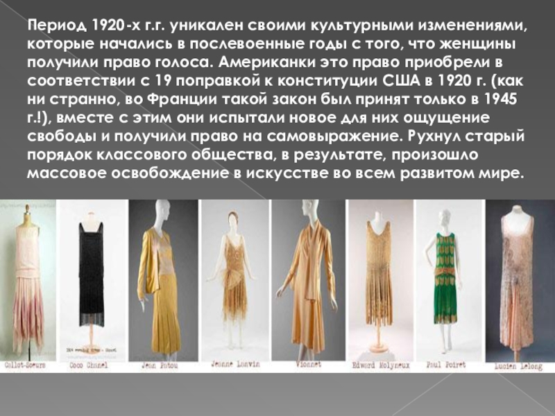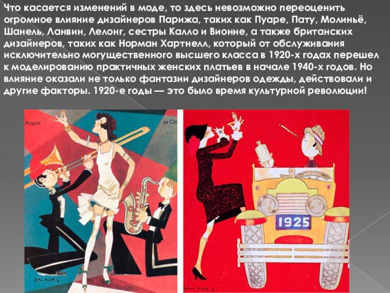 дизайнеров Парижа, таких как Пуаре, Пату, Молиньё, Шанель, Ланвин, Лелонг, сестры Калло и Вионне, а также британских дизайнеров, таких как Норман Хартнелл, который от обслуживания исключительно могущественного высшего класса в 1920-х годах перешел к моделированию практичных женских платьев в начале 1940-х годов. Но влияние оказали не только фантазии дизайнеров одежды, действовали и другие факторы. 1920-е годы — это было время культурной революции!