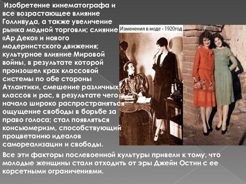 Все эти факторы послевоенной культуры привели к тому, что молодые женщины стали отходить от эры Джейн Остин с ее корсетными ограничениями.
