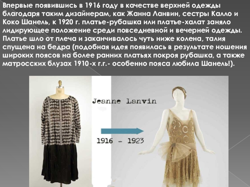 дизайнерам, как Жанна Ланвин, сестры Калло и Коко Шанель, к 1920 г. платье-рубашка или платье-халат заняло лидирующее положение среди повседневной и вечерней одежды. Платье шло от плеча и заканчивалось чуть ниже колена, талия спущена на бедра (подобная идея появилась в результате ношения широких поясов на более ранних платьях покроя рубашка, а также матросских блузах 1910-х г.г.- особенно пояса любила Шанель!).