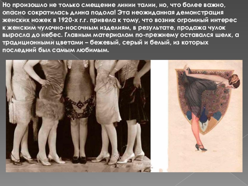 опасно сократилась длина подола! Эта неожиданная демонстрация женских ножек в 1920-х г.г. привела к тому, что возник огромный интерес к женским чулочно-носочным изделиям, в результате, продажа чулок выросла до небес. Главным материалом по-прежнему оставался шелк, а традиционными цветами – бежевый, серый и белый, из которых последний был самым любимым.