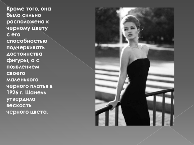 способностью подчеркивать достоинства фигуры, а с появлением своего маленького черного платья в 1926 г. Шанель утвердила вескость черного цвета.