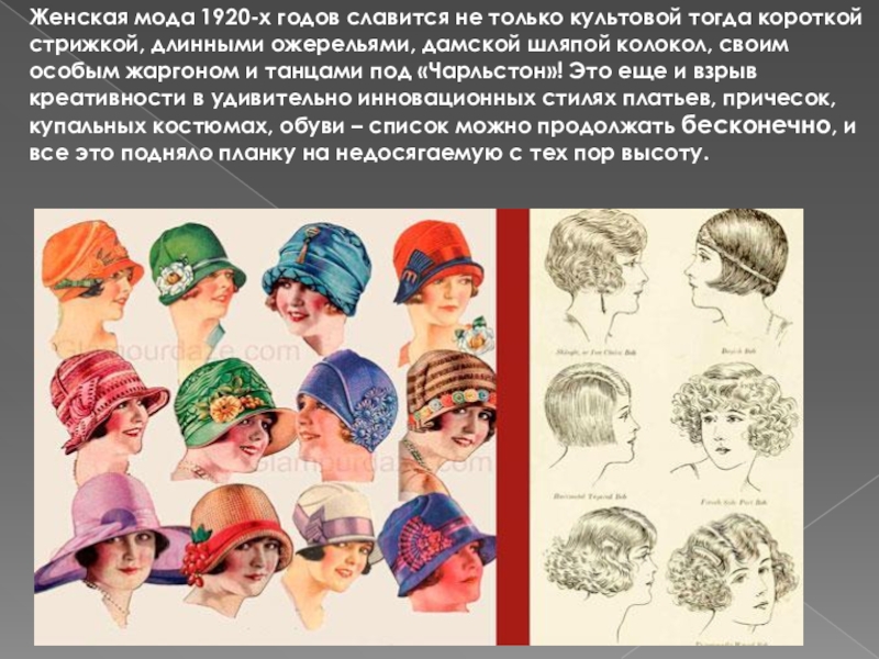 длинными ожерельями, дамской шляпой колокол, своим особым жаргоном и танцами под «Чарльстон»! Это еще и взрыв креативности в удивительно инновационных стилях платьев, причесок, купальных костюмах, обуви – список можно продолжать бесконечно, и все это подняло планку на недосягаемую с тех пор высоту.