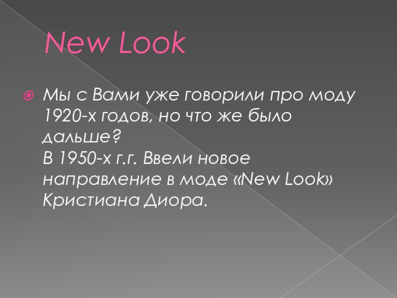 В 1950-х г.г. Ввели новое направление в моде «New Look» Кристиана Диора.