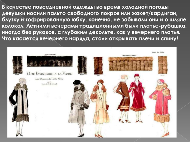 Слайд 10В качестве повседневной одежды во время холодной погоды девушки носили пальто