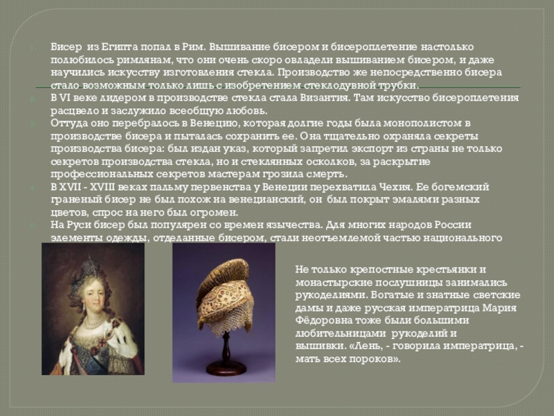 Не только крепостные крестьянки и монастырские послушницы занимались рукоделиями. Богатые и знатные светские дамы и даже русская императрица Мария Фёдоровна тоже были большими любительницами рукоделий и