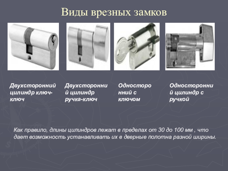 Как правило, длины цилиндров лежат в пределах от 30 до 100 мм , что дает возможность устанавливать их в дверные полотна разной ширины.
