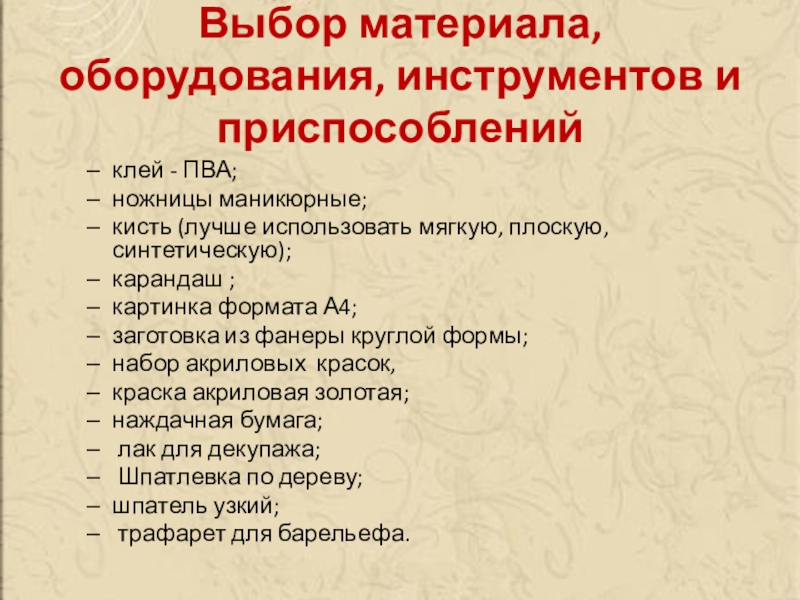 Слайд 7Выбор материала, оборудования, инструментов и приспособлений