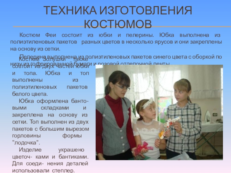 Костюм Золушки также состоит из двух частей юбки и топа. Юбка и топ выполнены из полиэтиленовых пакетов белого цвета.