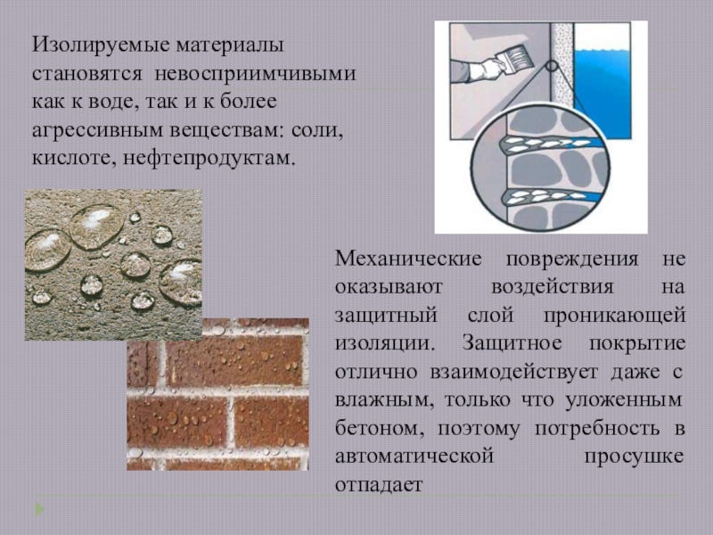 Изолируемые материалы становятся невосприимчивыми как к воде, так и к более агрессивным веществам: соли, кислоте, нефтепродуктам.