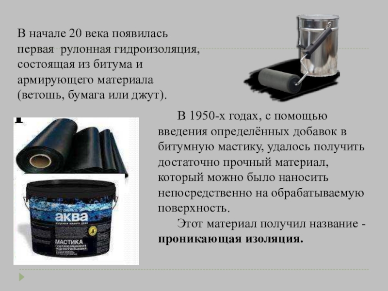 В 1950-х годах, с помощью введения определённых добавок в битумную мастику, удалось получить достаточно прочный материал, который можно было наносить непосредственно на обрабатываемую поверхность.