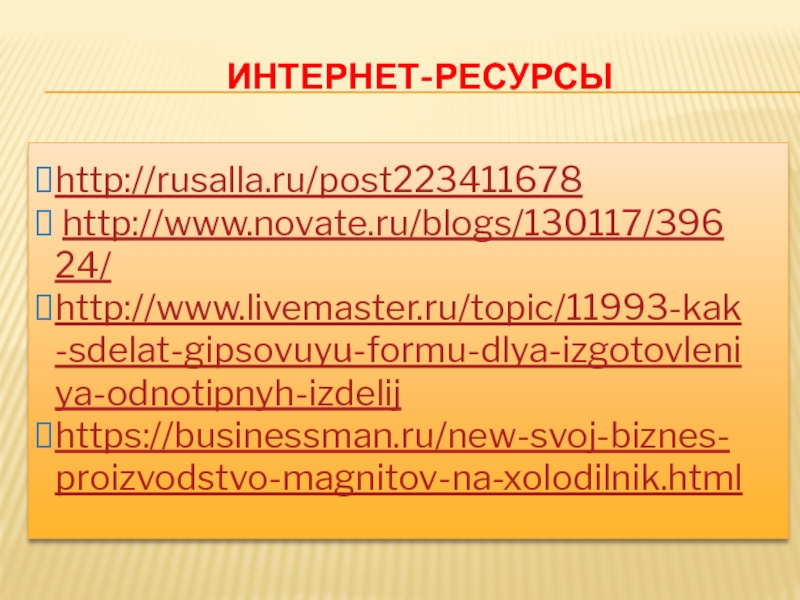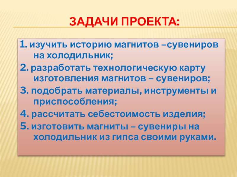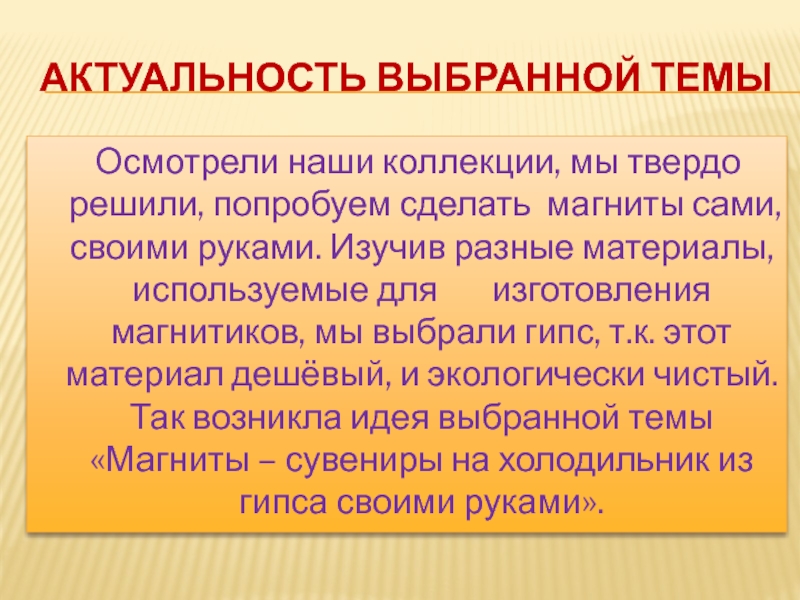 сделать магниты сами, своими руками. Изучив разные материалы, используемые для изготовления магнитиков, мы выбрали гипс, т.к. этот материал дешёвый, и экологически чистый. Так возникла идея выбранной темы «Магниты – сувениры на холодильник из гипса своими руками».