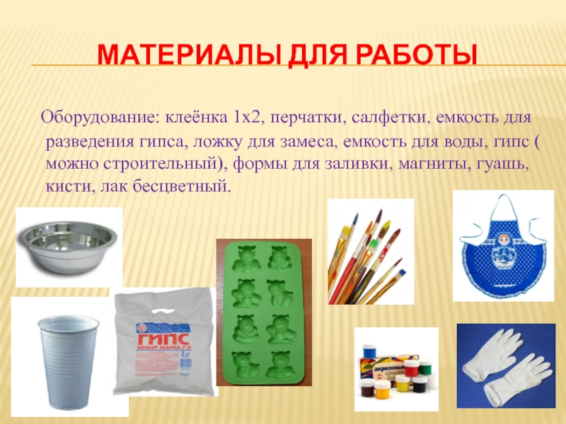 разведения гипса, ложку для замеса, емкость для воды, гипс ( можно строительный), формы для заливки, магниты, гуашь, кисти, лак бесцветный.