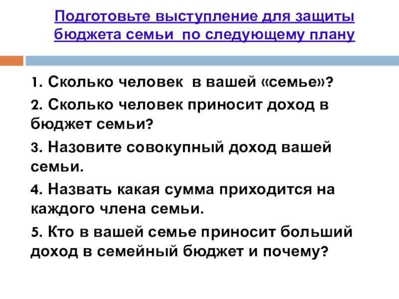 Подготовьте выступление для защиты бюджета семьи по следующему плану 1. Сколько человек в вашей «семье»?2. Сколько человек