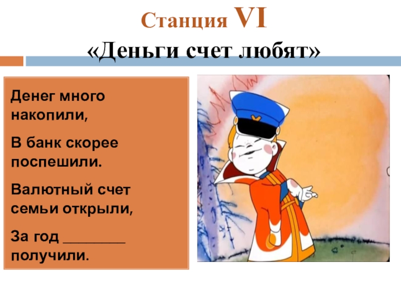 Станция VI «Деньги счет любят»Денег много накопили,В банк скорее поспешили.Валютный счет семьи открыли,За год ________ получили.
