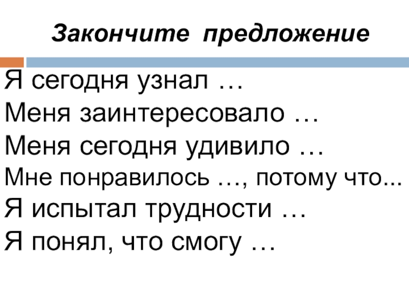 Закончите предложениеЯ сегодня узнал …Меня заинтересовало …Меня сегодня удивило …Мне понравилось …, потому что... Я испытал трудности