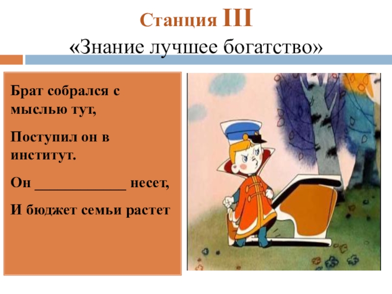 Станция III «Знание лучшее богатство» Брат собрался с мыслью тут,Поступил он в институт.Он ____________ несет,И бюджет