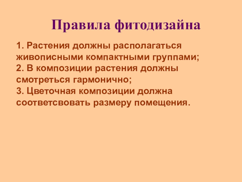 Правила фитодизайна1. Растения должны располагаться живописными компактными группами; 2. В композиции растения должны смотреться гармонично; 3. Цветочная композиции должна соответсвовать размеру помещения.