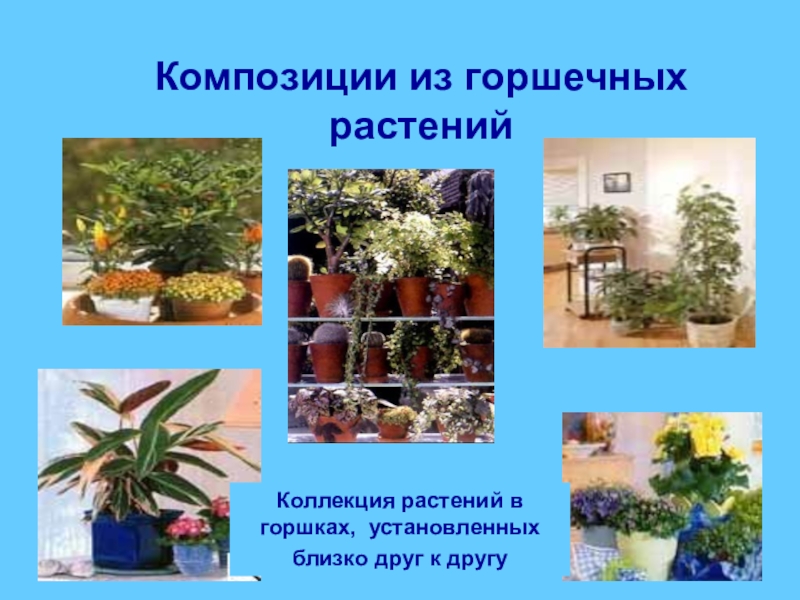 Композиции из горшечных растенийКоллекция растений в горшках, установленных близко друг к другу