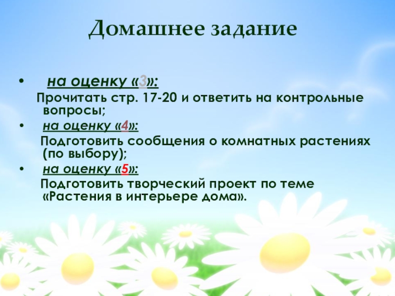 Домашнее задание на оценку «3»:	Прочитать стр. 17-20 и ответить на контрольные вопросы;на оценку «4»:	 Подготовить сообщения о