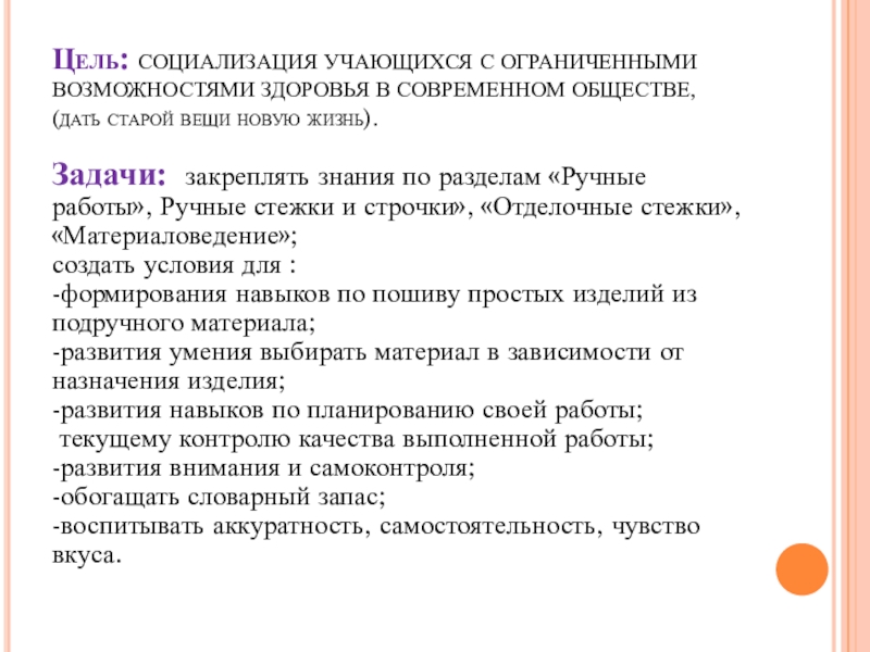 Задачи: закреплять знания по разделам «Ручные работы», Ручные стежки и строчки», «Отделочные стежки», «Материаловедение»;