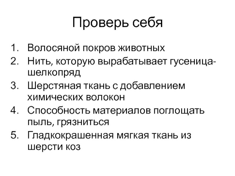 Проверь себяВолосяной покров животныхНить, которую вырабатывает гусеница-шелкопрядШерстяная ткань с добавлением химических волоконСпособность материалов поглощать пыль, грязнитьсяГладкокрашенная мягкая