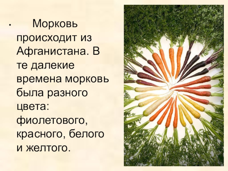 Слайд 2 Морковь происходит из Афганистана. В те далекие времена