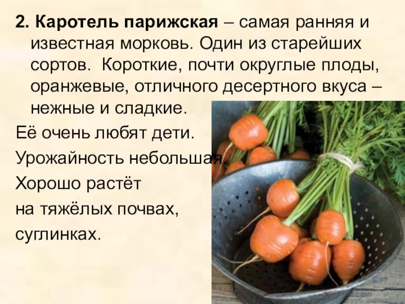 2. Каротель парижская – самая ранняя и известная морковь. Один из старейших